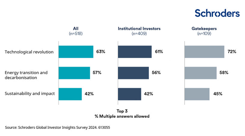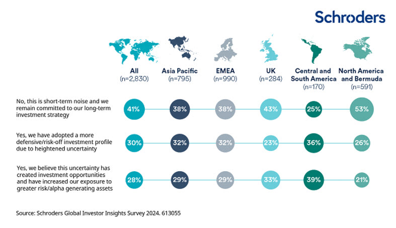 Ο βραχυπρόθεσμος «θόρυβος» από τον φετινό εκλογικό κύκλο δεν φαίνεται να επηρέασε τους παγκόσμιους επενδυτές, οι οποίοι στράφηκαν στην αξιοποίηση των σημαντικών τάσεων της αποπαγκοσμιοποίησης, ανατροπής (λόγω ισχυρού πληθωρισμού, μεταβαλλόμενου περιβάλλοντος επιτοκίων ή ακόμη και λόγω της τεχνολογίας) και απανθρακοποίησης, ενισχύοντας την έκθεσή τους σε παγκόσμιες μετοχές και Private Equity, σύμφωνα με τη φετινή έρευνα της Schroders, με τίτλο «Global Investor Study».