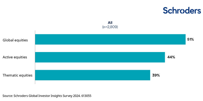 Από την άλλη πλευρά, περισσότεροι από τους μισούς επενδυτές (51%) αναμένουν να αυξήσουν τις κατανομές τους σε παγκόσμιες μετοχές τα επόμενα δύο χρόνια. Είναι ενδιαφέρον το γεγονός ότι σχεδόν οι μισοί από τους επενδυτές (44%) σκοπεύουν να αυξήσουν τις κατανομές τους σε ενεργή διαχείριση μετοχών, ενώ η ζήτηση για θεματικές μετοχές (39%) είναι επίσης υψηλή. Περίπου το 30% των θεσμικών επενδυτών και των διαχειριστών κεφαλαίων δήλωσαν ότι σκοπεύουν να αυξήσουν την έκθεση τους στις επενδύσεις ενεργειακής μετάβασης.