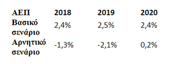 – Για το ΑΕΠ, το βασικό σενάριο προβλέπει ρυθμό ανάπτυξης 2,4%, 2,5% και 2,4% το 2018, 2019 και 2020 αντίστοιχα. Το δυσμενές σενάριο περιλαμβάνει συρρίκνωση 1,3% φέτος και 2,1% το 2019 προτού η οικονομία αναπτυχθεί κατά 0,2% το 2020.