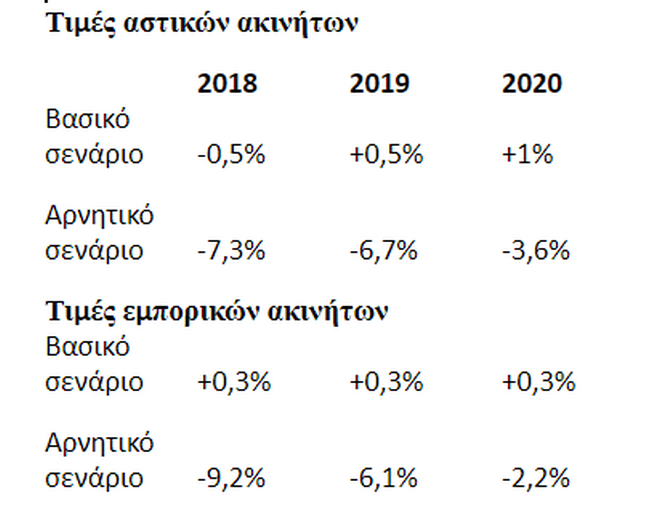 Για τις τιμές των εμπορικών ακινήτων το βασικό σενάριο προβλέπει ετήσια αύξηση 0,3% κάθε έτος, ενώ το δυσμενές προβλέπει βουτιά 9,2% το 2018, 6,1% το 2019 και 2,2% το 2020.