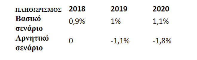 – Για τον πληθωρισμό, το βασικό σενάριο προβλέπει να διαμορφωθεί στο 0,9% αυτό το έτος, 1% και 1,1% το 2019 και το 2020 αντίστοιχα, με το δυσμενές σενάριο να κάνει λόγο για μηδενικό πληθωρισμό το 2018, -1,1% το 2019 και -1,8% το 2020.