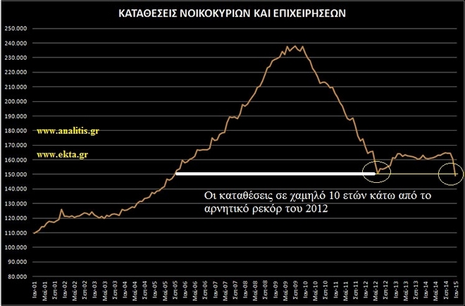 Αν τα στοιχεία είναι ακριβή τότε οι καταθέσεις ελληνικών νοικοκυριών και επιχειρήσεων έχουν μειωθεί κοντά στα 149,3 δις ευρώ, κάτω από το ναδίρ του 2012, στα 150,6 δις ευρώ και στο χαμηλότερο επίπεδο από το 2005.