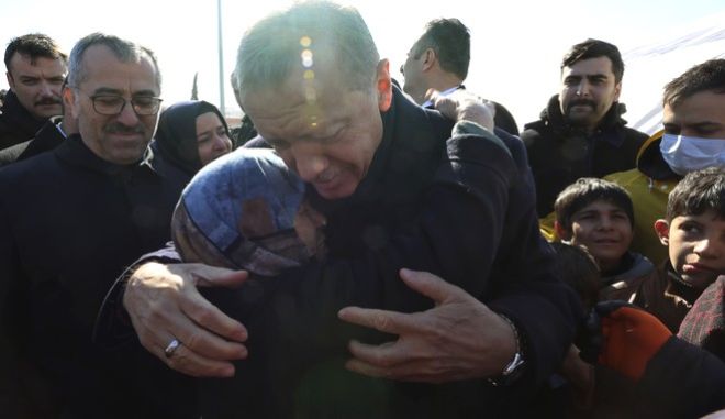 Ο Ρετζέπ Ταγίπ Ερντογάν κατά την επίσκεψή του στις πληγείσες από τον σεισμό περιοχές της Τουρκίας TURKISH PRESIDENCY VIA AP