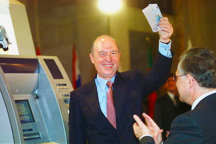 Ξημερώματα της Πρωτοχρονιάς του 2002. Ο Κ. Σημίτης φωτογραφίζεται περιχαρής δίπλα σε ΑΤΜ, κρατώντας στα χέρια του χαρτονομίσματα του νέου νομίσματος της χώρας, του ευρώ. Δίπλα του, ο τότε διοικητής της Τραπέζης της Ελλάδος Λουκάς Παπαδήμος, χειροκροτεί.