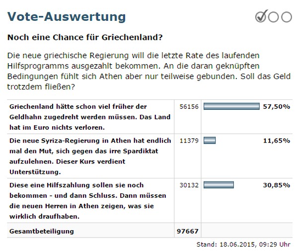 Στην ίδια ηλεκτρονική ψηφοφορία, το 31% (27.000 άτομα) επέλεξε την απάντηση “να δοθεί στην Ελλάδα άλλη μία ευκαιρία, αλλά τέρμα” και το 11% (9.671) ψήφισε “η Ελλάδα αντιστέκεται στις πολιτικές λιτότητας και να την υποστηρίξουμε”. Στην ψηφοφορία έχουν συμμετάσχει μέχρι στιγμής 100.000 άτομα.