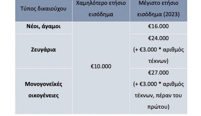 Το ετήσιο εισόδημα πρέπει να είναι τουλάχιστον 10.000 ευρώ ενώ το μέγιστο, εκείνο που ισχύει για την καταβολή του επιδόματος θέρμανσης. Για το 2023 τα όρια έχουν ως εξής: