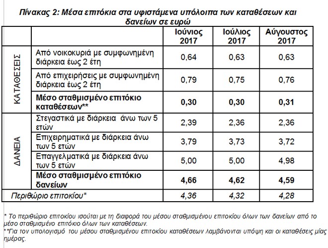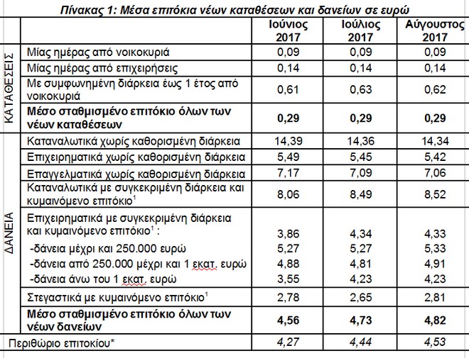 Αμετάβλητο παρέμεινε, τον Αύγουστο του 2017, το μέσο σταθμισμένο επιτόκιο του συνόλου των νέων καταθέσεων, ενώ το μέσο σταθμισμένο επιτόκιο των νέων δανείων αυξήθηκε. Το περιθώριο επιτοκίου* αυξήθηκε στις 4,53 εκατοστιαίες μονάδες, έναντι 4,44 μονάδων τον προηγούμενο μήνα (βλ. Πίνακα 1).