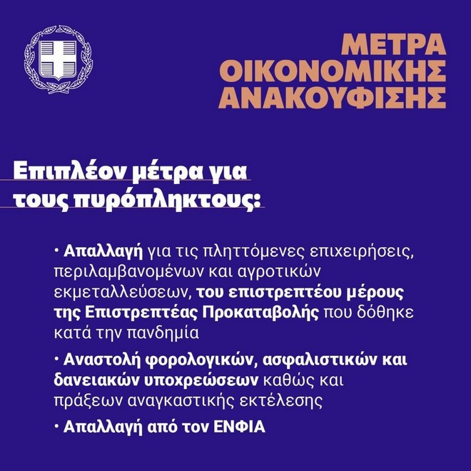 *Για τα φυσικά και νομικά πρόσωπα, καθώς και τις νομικές οντότητες που επλήγησαν και είναι δικαιούχοι των μέτρων της στεγαστικής συνδρομής ή/και της επιχορήγησης για τις επιχειρήσεις, αναστέλλεται η διενέργεια κάθε πράξης αναγκαστικής εκτέλεσης επί της κινητής ή ακίνητης περιουσίας τους. Το χρονικό διάστημα της αναστολής θα εξαρτηθεί από το μέγεθος της ζημίας. Η αναστολή καταλαμβάνει, ιδίως, τη διενέργεια πλειστηριασμών, κατασχέσεων, αποβολών και προσωπικών κρατήσεων.