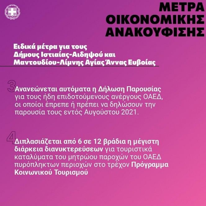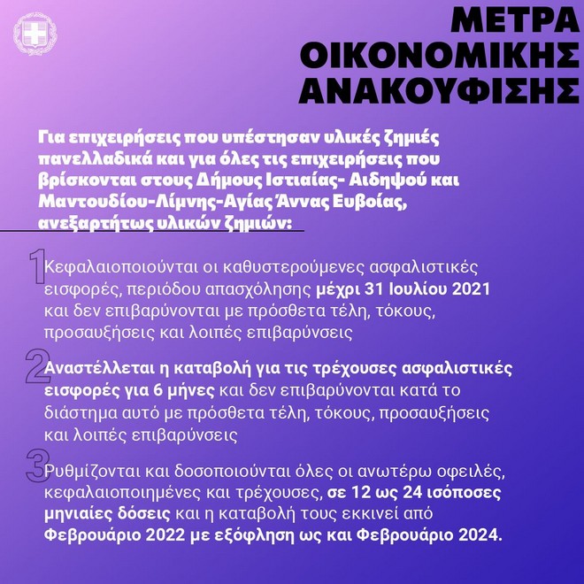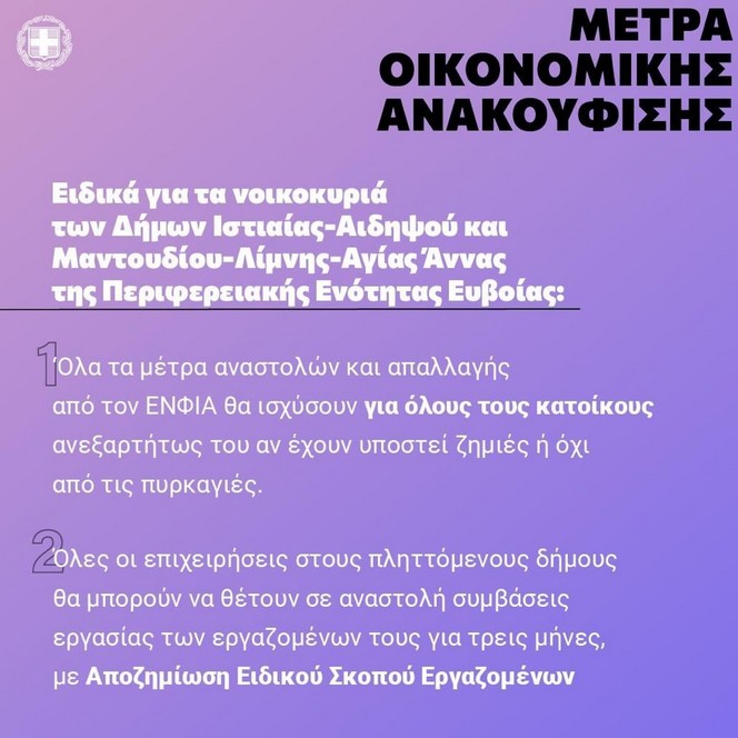 *Επιπλέον, ειδικά για το 2021, το σύνολο των ακινήτων που βρίσκονται σε αυτούς τους δύο πληττόμενους δήμους, απαλλάσσονται από τον ΕΝΦΙΑ. Επιπρόσθετα, οι επιχειρήσεις- εργοδότες του ιδιωτικού τομέα, ανεξαρτήτως κλάδου και επιχειρηματικής δραστηριότητας, στους πληττόμενους δήμους της Εύβοιας, μπορούν να θέτουν σε αναστολή τις συμβάσεις εργασίας μέρους ή όλων των εργαζομένων τους, έως και για διάστημα 3 μηνών. Οι επιχειρήσεις- εργοδότες για όσο χρονικό διάστημα κάνουν χρήση του μέτρου της αναστολής των συμβάσεων εργασίας, υποχρεούνται να μην προβούν σε μειώσεις προσωπικού με καταγγελία των συμβάσεων εργασίας. Σε περίπτωση πραγματοποίησής τους, οι καταγγελίες αυτές είναι άκυρες.