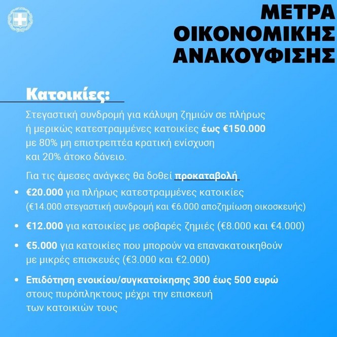 *Για όσες έχουν καταστραφεί ολοσχερώς, 20.000 ευρώ, εκ των οποίων 14.000 ευρώ είναι η προκαταβολή για τη στεγαστική συνδρομή και 6.000 ευρώ η αποζημίωση για την οικοσκευή.