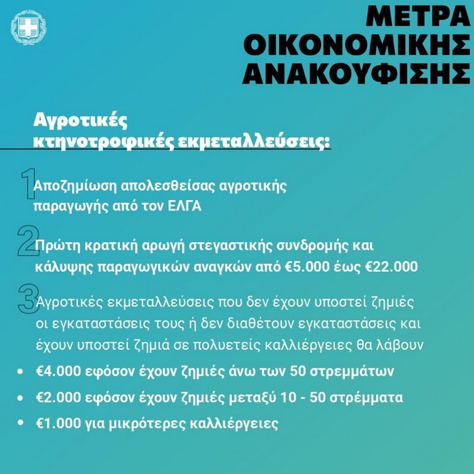 Το ασφαλισμένο στον ΕΛΓΑ ζωικό κεφάλαιο αποζημιώνεται από τον ΕΛΓΑ. Για τις μονοετείς καλλιέργειες, σε συνεργασία με το υπουργείο Αγροτικής Ανάπτυξης και τον ΕΛΓΑ, δρομολογείται η άμεση αντιμετώπιση των ζημιών, στο πλαίσιο των εξατομικευμένων ενισχύσεων ήσσονος σημασίας.
