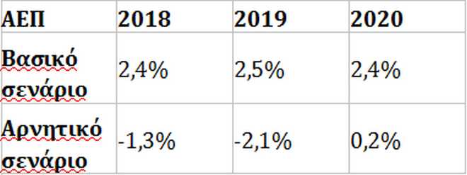-Για το ΑΕΠ, το βασικό σενάριο προβλέπει ρυθμό ανάπτυξης 2,4%, 2,5% και 2,4% το 2018, 2019 και 2020 αντίστοιχα. Το δυσμενές σενάριο περιλαμβάνει συρρίκνωση 1,3% φέτος και 2,1% το 2019 προτού η οικονομία αναπτυχθεί κατά 0,2% το 2020.