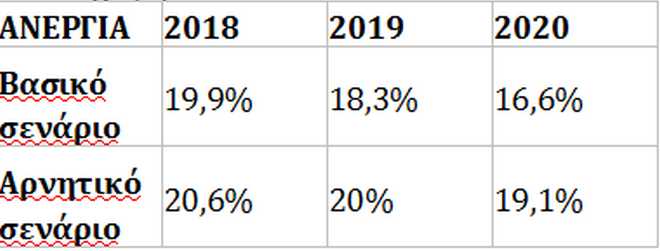 -Η ανεργία θα υποχωρήσει στο 19,9% αυτό το έτος και θα συνεχίσει να υποχωρεί στο 18,3% το 2019 και 16,6% το 2020 στο βασικό σενάριο, ενώ στο δυσμενές σενάριο αναμένεται να διαμορφωθεί στο 20,6% το 2018 για να υποχωρήσει στο 20% το 2019 και 19,1% το 2020.