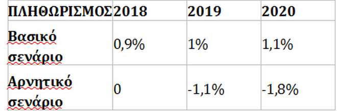 -Για τον πληθωρισμό, το βασικό σενάριο προβλέπει να διαμορφωθεί στο 0,9% αυτό το έτος, 1% και 1,1% το 2019 και το 2020 αντίστοιχα, με το δυσμενές σενάριο να κάνει λόγο για μηδενικό πληθωρισμό το 2018, -1,1% το 2019 και -1,8% το 2020.
