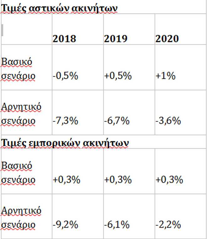 Για τις τιμές των εμπορικών ακινήτων το βασικό σενάριο προβλέπει ετήσια αύξηση 0,3% κάθε έτος, ενώ το δυσμενές προβλέπει βουτιά 9,2% το 2018, 6,1% το 2019 και 2,2% το 2020.