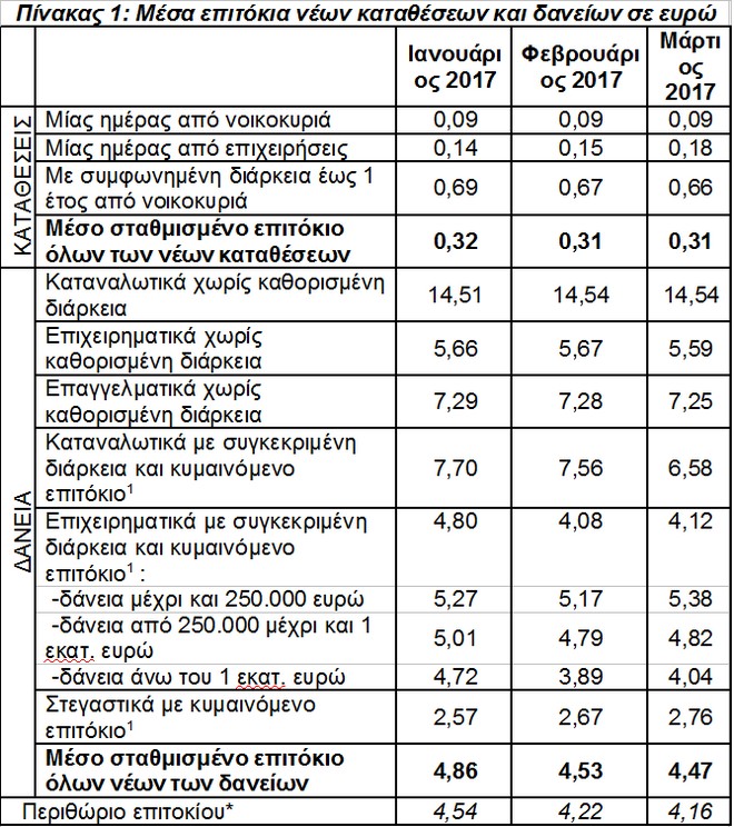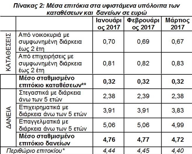 Αναλυτικότερα, το μέσο σταθμισμένο επιτόκιο του συνόλου των υφιστάμενων καταθέσεων (συμπεριλαμβανομένων των καταθέσεων μίας ημέρας) παρέμεινε αμετάβλητο σε σχέση με τον προηγούμενο μήνα στο 0,32%, ενώ το αντίστοιχο επιτόκιο των δανείων μειώθηκε κατά 5 μονάδες βάσης και διαμορφώθηκε στο 4,72%.