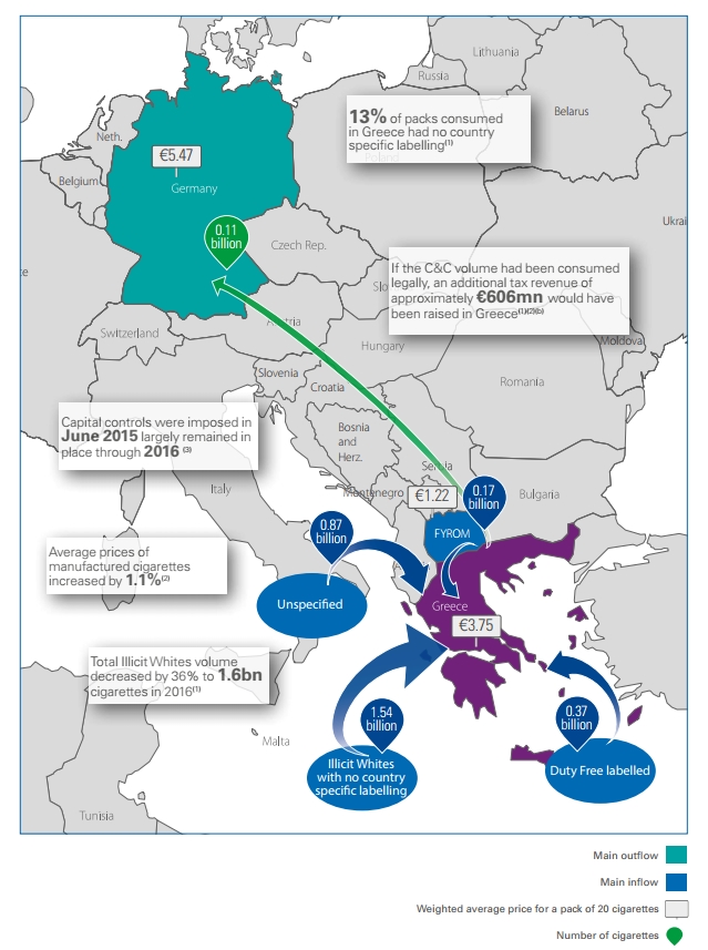 Σύμφωνα με τη μελέτη, 48,3 δισεκατομμύρια τσιγάρα, δηλαδή το 9,1% των τσιγάρων που καταναλώθηκαν συνολικά στην Ευρώπη το 2016, ήταν παράνομα. Το αντίστοιχο ποσοστό το 2015 έφτανε το 9,8%. Η ποσοστιαία μεταβολή κατά 8,8% που σημειώθηκε το 2016 στην κατανάλωση των παράνομων τσιγάρων στην Ευρώπη, αποτελεί τη μεγαλύτερη ετήσια πτώση σε διάστημα τριών ετών. Στην πρώτη θέση στην κατανάλωση παράνομων τσιγάρων βρίσκεται για ακόμη μια χρονιά η Λετονία με ποσοστό 22,6%, ενώ ακολουθούν η Ελλάδα (18,8%), η Ιρλανδία (17,5%), η Μάλτα (17,2%) και η Λιθουανία (17%).