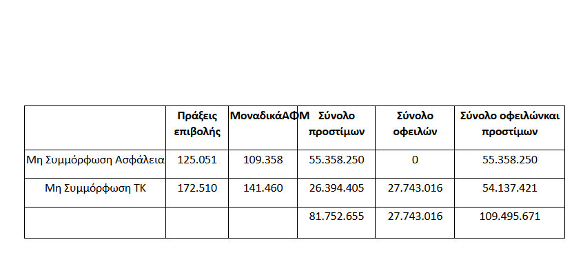 Το συνολικό ποσό των προστίμων και οφειλών ανέρχεται σε 109,5 εκ. ευρώ.
