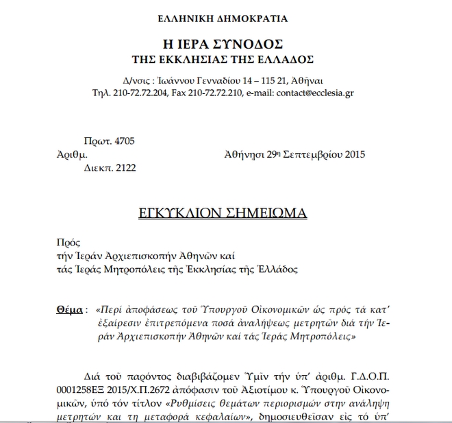 Η απόφαση του Υπουργείου Οικονομικών αναρτήθηκε και ως Εγκύκλιος της Ιεράς Συνόδου.