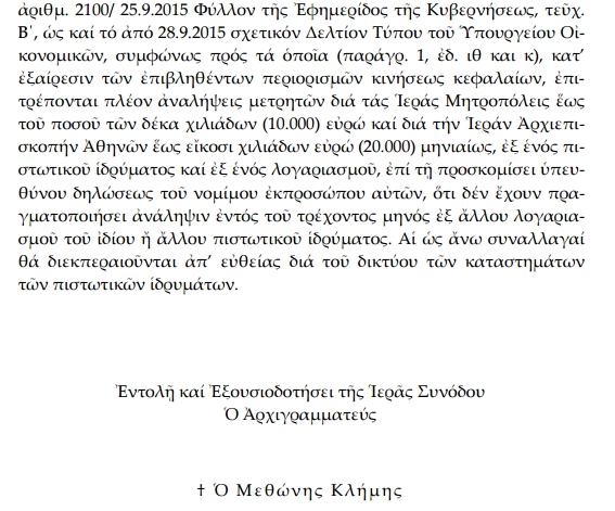Διά τοῦ παρόντος διαβιβάζομεν Ὑμῖν τήν ὑπ’ ἀριθμ. Γ.Δ.Ο.Π. 0001258ΕΞ 2015/Χ.Π.2672 ἀπόφασιν τοῦ Ἀξιοτίμου κ. Ὑπουργοῦ Οἰκονομικῶν, ὑπό τόν τίτλον «Ρυθμίσεις θεμά-των περιορισμών στην ανάληψη μετρητών και τη μεταφορά κε-φαλαίων», δημοσιευθεῖσαν εἰς τό ὑπ’ ἀριθμ. 2100/ 25.9.2015 Φύλλον τῆς Ἐφημερίδος τῆς Κυβερνήσεως, τεῦχ. Β΄, ὡς καί τό ἀπό 28.9.2015 σχετικόν Δελτίον Τύπου τοῦ Ὑπουργείου Οἰκονομικῶν, συμφώνως πρός τά ὁποῖα (παράγρ. 1, ἐδ. ιθ και κ), κατ’ ἐξαίρεσιν τῶν ἐπιβληθέντων περιορισμῶν κινήσεως κεφαλαίων, ἐπιτρέπονται πλέον ἀναλήψεις μετρητῶν διά τάς Ἱεράς Μητροπόλεις ἕως τοῦ ποσοῦ τῶν δέκα χιλιάδων (10.000) εὐρώ καί διά τήν Ἱεράν Ἀρχιεπισκοπήν Ἀθηνῶν ἕως εἴκοσι χιλιάδων εὐρώ (20.000) μηνιαίως, ἐξ ἑνός πιστωτικοῦ ἱδρύματος καί ἐξ ἑνός λογαριασμοῦ, ἐπί τῇ προσκομίσει ὑπευθύνου δηλώσεως τοῦ νομίμου ἐκπροσώπου αὐτῶν, ὅτι δέν ἔχουν πραγματοποιήσει ἀνάληψιν ἐντός τοῦ τρέχοντος μηνός ἐξ ἄλλου λογαριασμοῦ τοῦ ἰδίου ἤ ἄλλου πιστωτικοῦ ἱδρύματος. Αἱ ὡς ἄνω συναλλαγαί θά διεκπεραιοῦνται ἀπ’ εὐθείας διά τοῦ δικτύου τῶν καταστημάτων τῶν πιστωτικῶν ἱδρυμάτων.