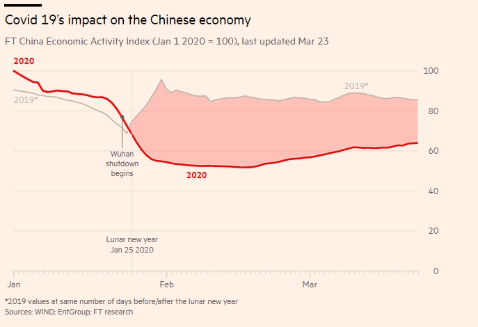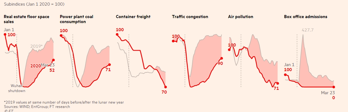 Η επιβράδυνση της Κίνας εξαιτίας της επιδημίας κορονοϊού είναι δεδομένη με ό,τι αυτό σημαίνει και για την παγκόσμια οικονομία. Προκειμένου να εντοπιστούν αυτές οι αλλαγές, οι Financial Times δημιούργησαν τη δική τους μέτρηση της επιβράδυνσης και της αναδυόμενης ανάκαμψης στην κινεζική οικονομία.