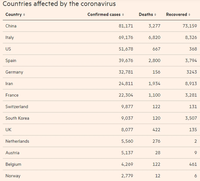Η πανδημία του κορονοϊού εξαπλώνεται και οι δείκτες είναι αμείλικτοι. Περισσότερες από 180 χώρες έχουν επιβεβαιώσει κρούσματα και οι Financial Times παρουσιάζουν το μέχρι στιγμής αντίκτυπο παγκοσμίως.