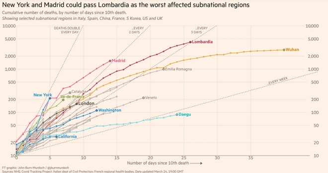 Σε πολλές χώρες ένας μικρός αριθμός περιφερειών έχουν χτυπηθεί περισσότερο από τον κορονοϊό. Η Λομβαρδία έχει ξεπεράσει τη Γουχάν ως η πιο πληγείσα περιοχή στον κόσμο, ενώ στην Ισπανία η Μαδρίτη θα μπορούσε σύντομα να ξεπεράσει και αυτή.