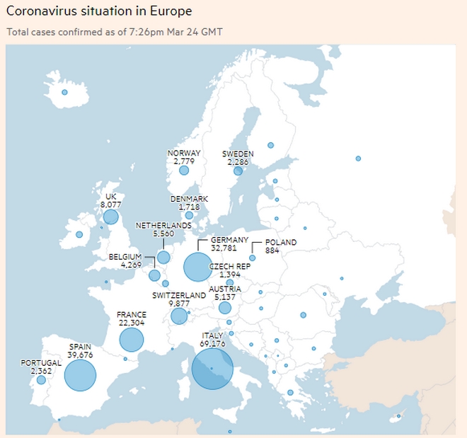 Το επίκεντρο του κορονοϊού είναι σήμερα η Ευρώπη, με τον μεγαλύτερο αριθμό επιβεβαιωμένων κρουσμάτων στην Ιταλία, ενώ ο αριθμός των νεκρών αυξάνεται ταχύτερα στην Ιταλία και την Ισπανία απ’ ό, τι στην Κίνα στο ίδιο στάδιο της επιδημίας.