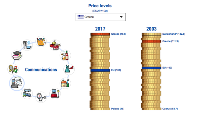 Στο αντίποδα η Ελλάδα είναι κατά 54% πιο ακριβή από τον μέσο όρο της ΕΕ και η πιο ακριβή χώρα σε ότι αφορά την κατηγορία των ταχυδρομικών και τηλεφωνικών υπηρεσιών. Αξίζει να σημειωθεί ότι οι συγκεκριμένες υπηρεσίες στην χώρα μας ήταν επίσης πάνω από τον μέσο όρο της ΕΕ και το 2003 αλλά μόλις 11,9%.