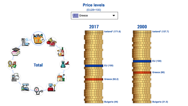 Στο σύνολο των αγαθών και των υπηρεσιών η Ελλάδα παραμένει κάτω από τον μέσο όρο (100) της Ευρώπης αν και το κόστος ζωής αυξήθηκε με τον δείκτης της χώρας να διαμορφώνεται στο 82,2 από 80 που ήταν το 2000.