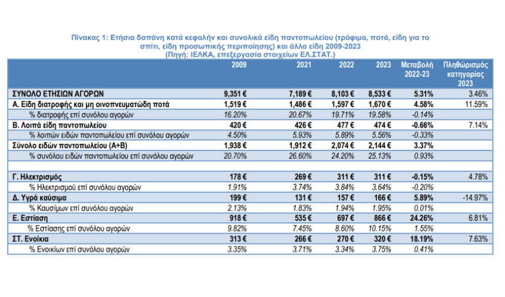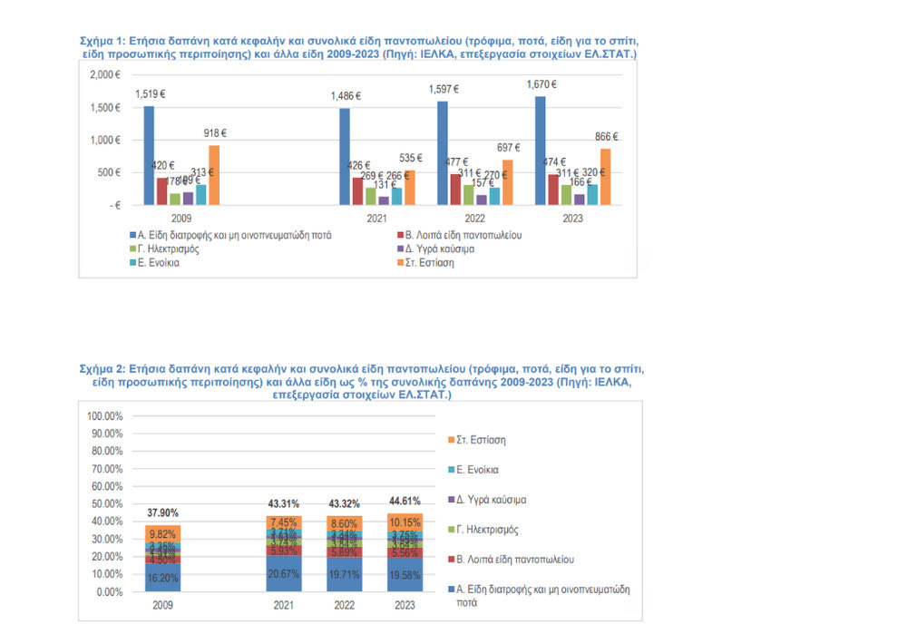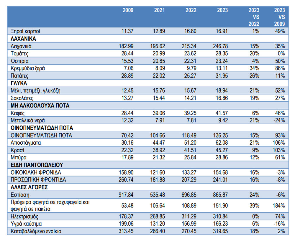 - αύξηση στη δαπάνη των αγορών σε βασικές πηγές υδατανθράκων, ενδεικτικά αύξηση της δαπάνης για ψωμί κατά 10% το 2023 σε σχέση με το 2022 και κατά 23% σε σχέση με το 2009. Ανάλογη αύξηση και για τα ζυμαρικά κατά 10% και 23% αντίστοιχα.