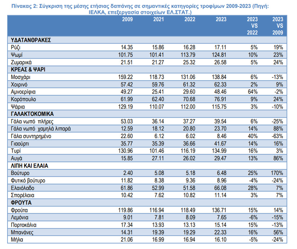 - Αύξηση της δαπάνης για ελαιόλαδο κατά 28% το 2023 έναντι του 2022, αλλά μόλις κατά 7% σε σχέση με το 2009.