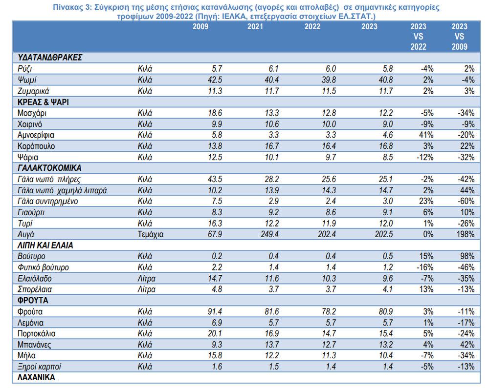 Ακόμα πιο ενδιαφέροντα είναι τα στοιχεία της κατανάλωσης σε ποσότητες τα οποία καταγράφουν μεγάλες μεταβολές πλέον σε επίπεδο διατροφής και τα οποία δείχνουν: