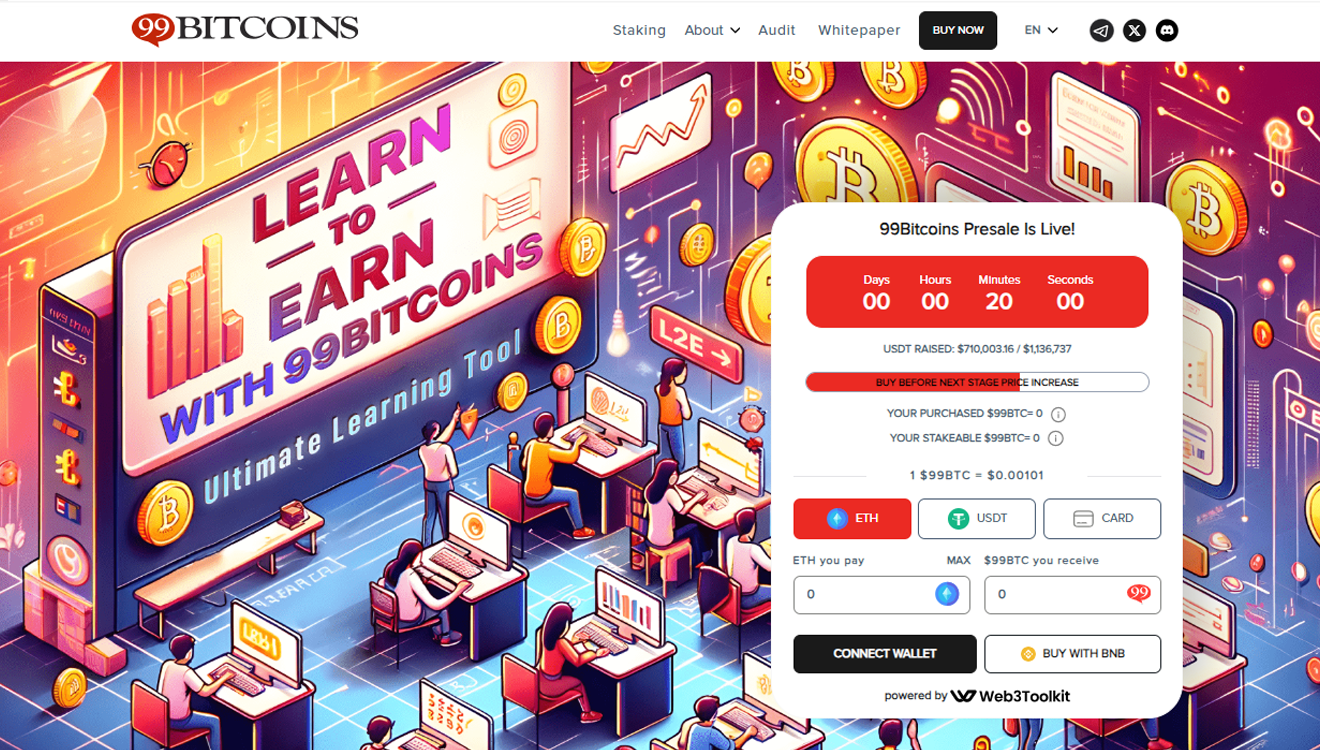 Το 99Bitcoins είναι ένα εξίσου δημοφιλές κρυπτονόμισμα, κυρίως λόγω της πρωτοποριακής του πλατφόρμας. Συγκεκριμένα, οι χρήστες της πλατφόρμας Learn-to-earn που διαθέτει το έργο, έχουν τη δυνατότητα να αποκτήσουν αρκετές γνώσεις πάνω στα κρυπτονομίσματα, κερδίζοντας ταυτόχρονα ανταμοιβές σε 99BTC tokens. Με πάνω από 2 εκατομμύρια ενεργούς χρήστες, 700+ συνδρομητές στο YouTube και ένα εξαιρετικό airdrop αξίας 99.999 δολαρίων, το 99Bitcoins σίγουρα αποτελεί ένα από τα καλύτερα Web 3.0 κρυπτονομίσματα και μια επενδυτική επιλογή που αξίζει να εξετάσει κανείς.