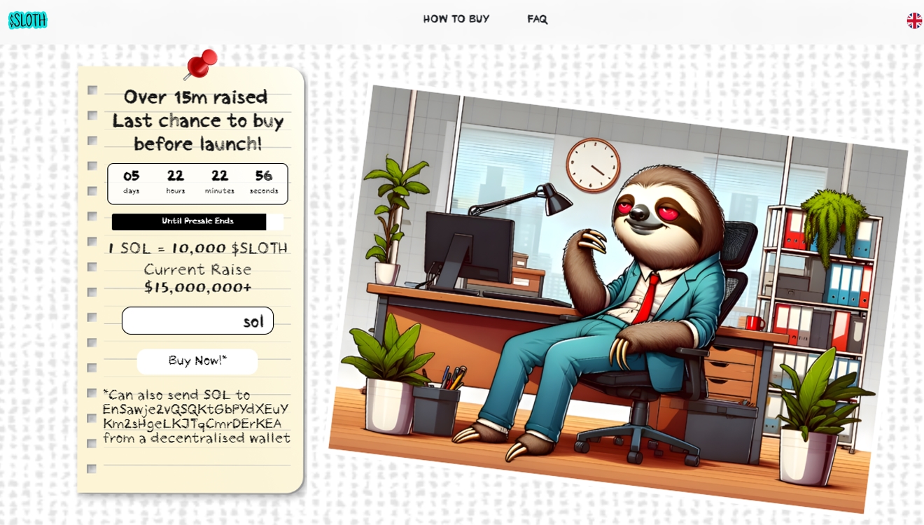 Το Slothana αποτελεί ένα από τα πιο δημοφιλή κρυπτονομίσματα στο Solana blockchain αυτή τη στιγμή, το οποίο έχει προσελκύσει μια μεγάλη ροή κεφαλαίων κατά την προπώληση. Ειδικότερα, το έργο κατάφερε μέσα σε σύντομο χρονικό διάστημα να συγκεντρώσει πάνω από 15 εκατομμύρια δολάρια. Με την ολοκλήρωση της προπώλησης και την επίσημη κυκλοφορία να έχει οριστεί για τις 28 Απριλίου 2024, οι προοπτικές ανόδου του $SLOTH είναι πραγματικά τεράστιες.