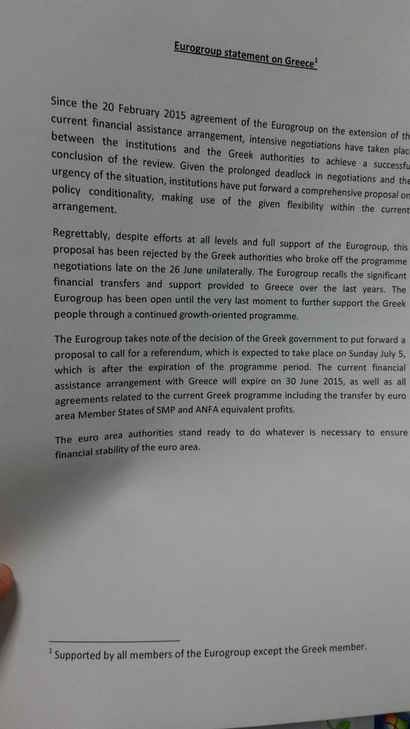 Tο Εurogroup σημειώνει με λύπη του, ότι η ελληνική κυβέρνηση διακόπτει «μονομερώς» τη διαπραγμάτευση και απορρίπτει την πρόταση που υπέβαλαν οι Θεσμοί
