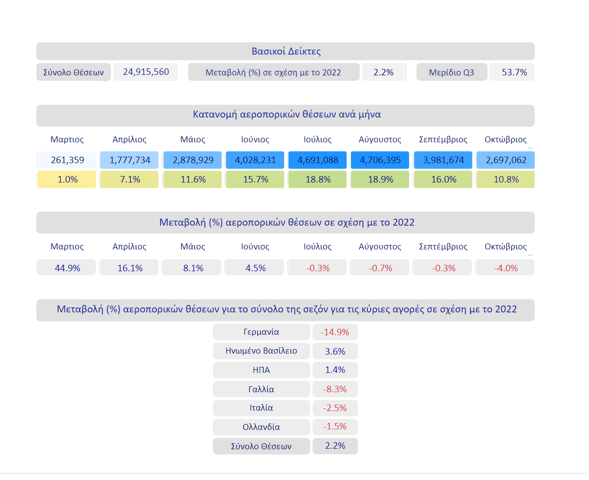 Στο σύνολο της τουριστικής σεζόν του 2023 οι προγραμματισμένες αεροπορικές θέσεις από τις κύριες αγορές εισερχόμενου τουρισμού, δείχνουν από τη Γερμανία να είναι σημαντικά μειωμένες κατά 14,9%, τη Γαλλία κατά -8,3%, την Ιταλία κατά – 2,5% και την Ολλανδία κατά -1,5%. Η μείωση των θέσεων από Γερμανία αφορά σε πάνω από 700.000 θέσεις και περίπου 150.000 από Γαλλία. Μείωση σε ποσοστό 12,1% εμφανίζουν οι αεροπορικές θέσεις και από Ελβετία, ίδιο ποσοστό κάτω και από Σουηδία, ενώ η μείωση από Δανία φτάνει το 16,4%, πάντα στο σύνολο της σεζόν.