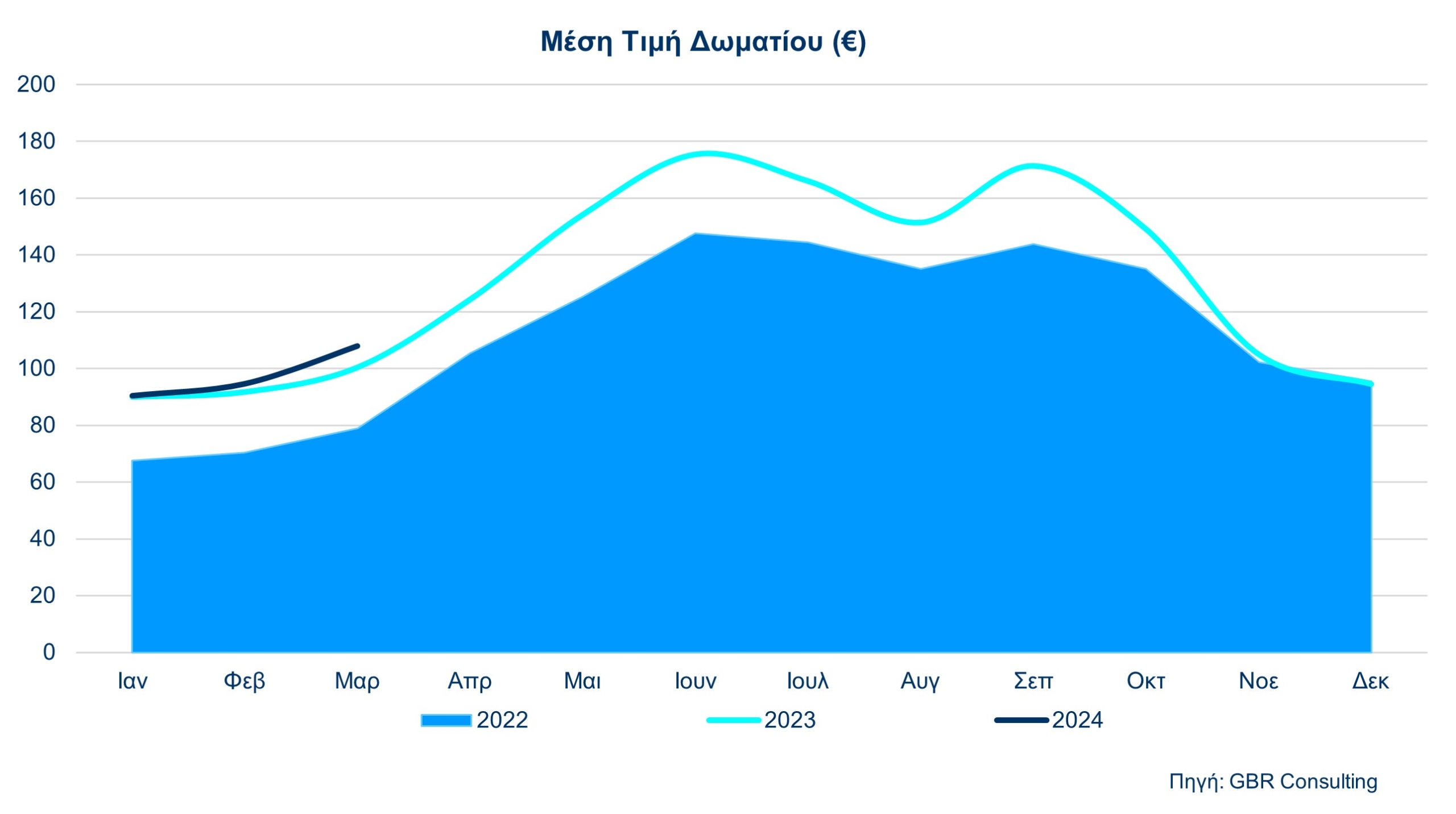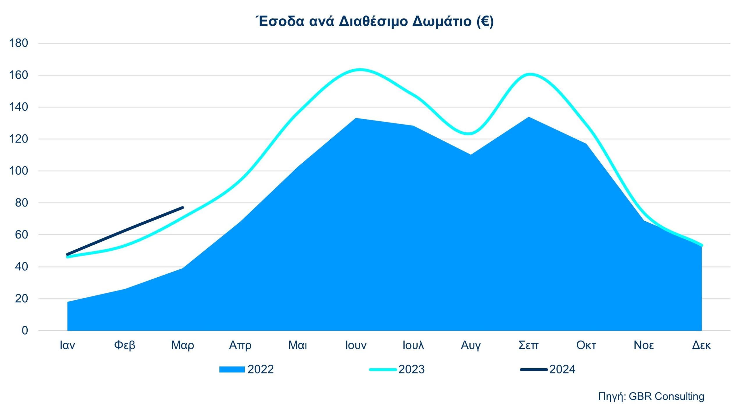 Τα στοιχεία δείχνουν ότι ο Μάρτιος 2024 σε ότι αφορά στην μέση πληρότητα δεν σημείωσε μικρή άνοδο κατά 1,5% σε σχέση με τον ίδιο μήνα πέρυσι, ενώ η μέση τιμή ανέβηκε κατά 7,4% φτάνοντας τα 107,86 ευρώ και το Έσοδο ανά Διαθέσιμο Δωμάτιο τον Μάρτιο 2024 αυξήθηκε κατά 9%, φτάνοντας στα 77,08 ευρώ.