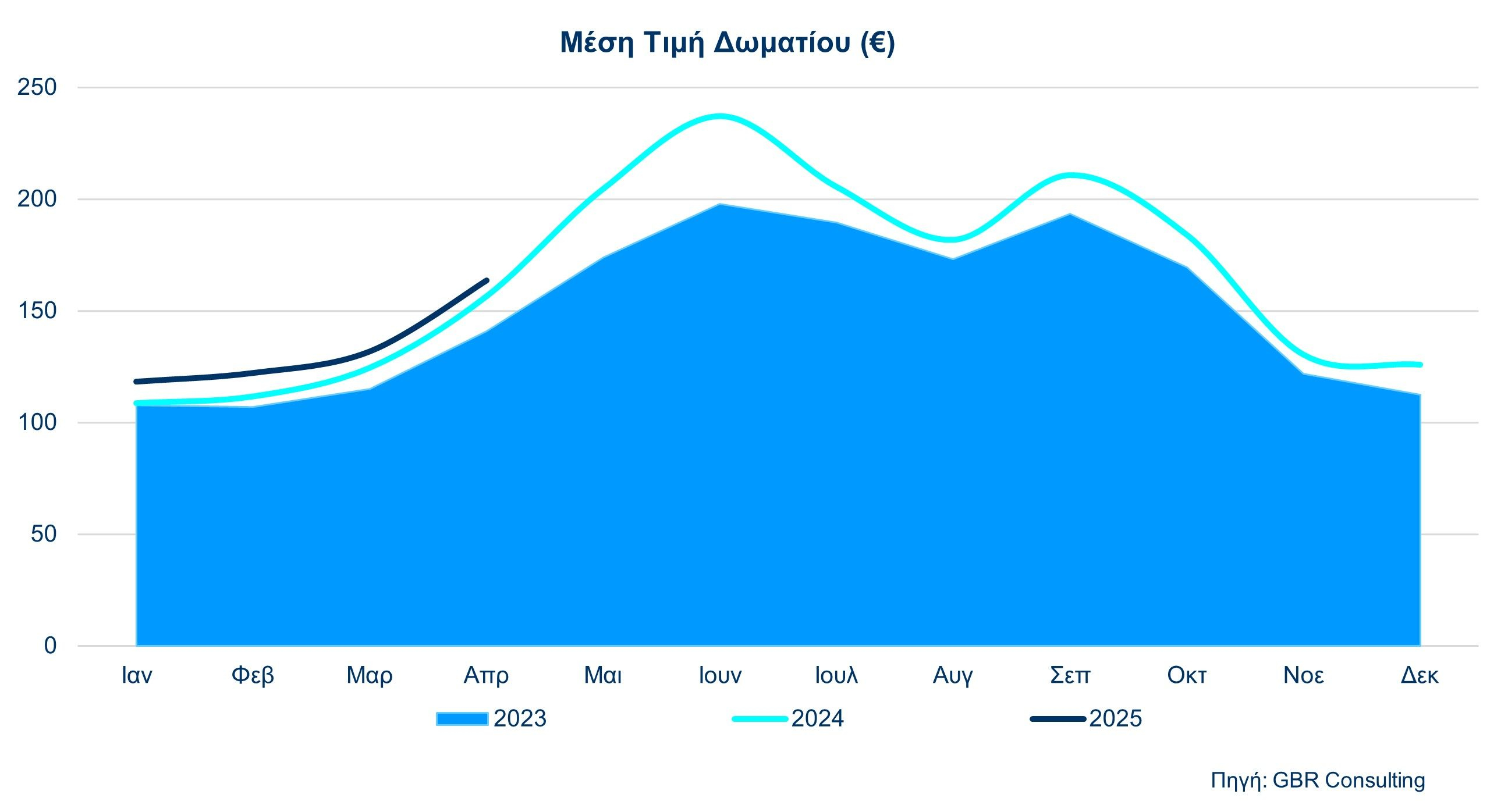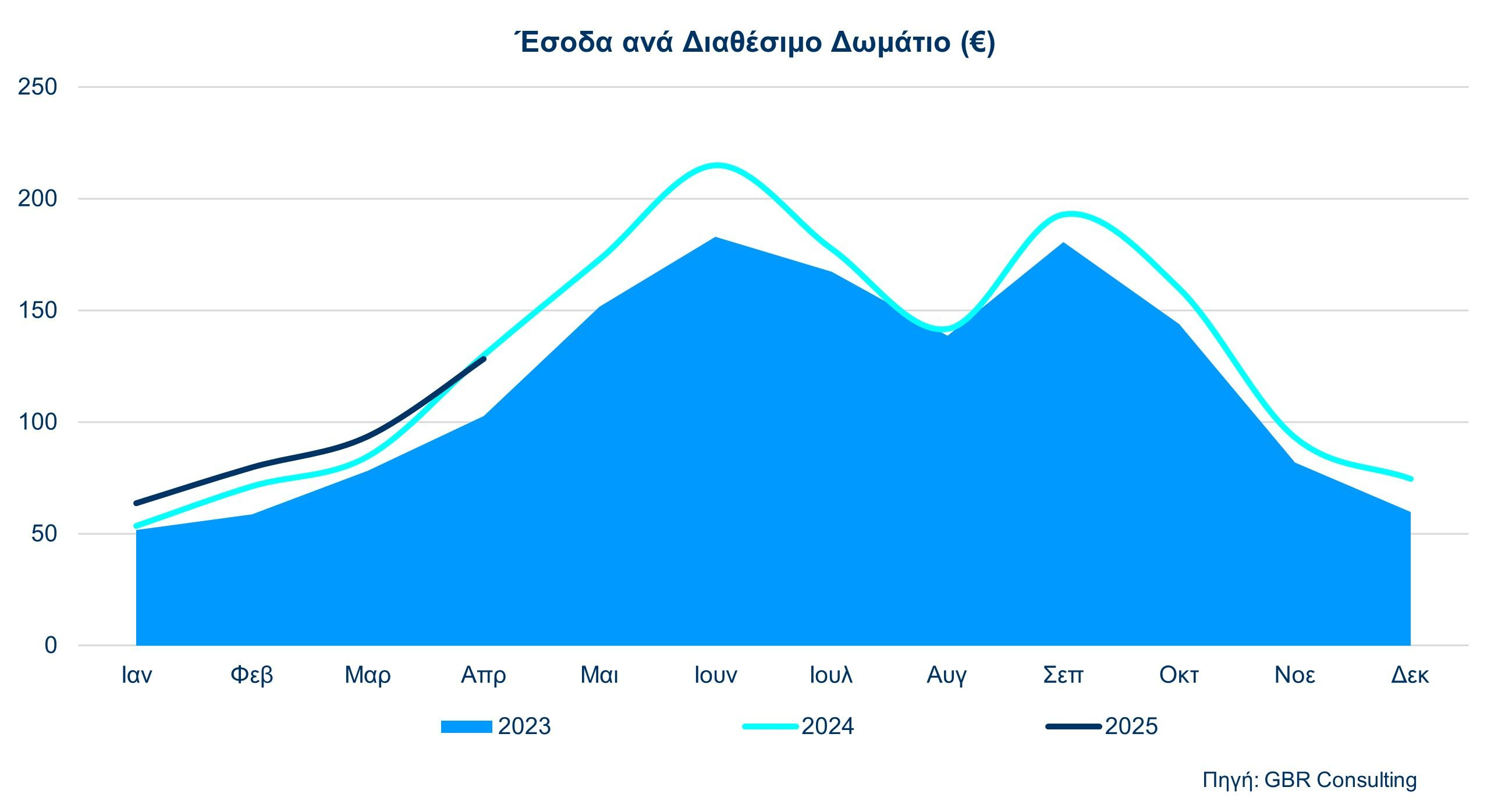 Ο Απρίλιος 2025 αναδείχθηκε ο καλύτερος μήνας του τετραμήνου από πλευράς απόδοσης, χωρίς όμως να φτάσει τα επίπεδα του αντίστοιχου περσινού μήνα. Η μέση πληρότητα διαμορφώθηκε στο 78,4% έναντι 83,1% του Απριλίου 2024, ενώ το RevPar έφτασε τα 128,33 ευρώ, μειωμένο ελαφρώς από τα 130,01 ευρώ του προηγούμενου έτους. Ωστόσο, η Μέση Τιμή Δωματίου παρουσίασε θετική μεταβολή: από 156,52 ευρώ το 2024, αυξήθηκε στα 163,68 ευρώ (+4,6%).