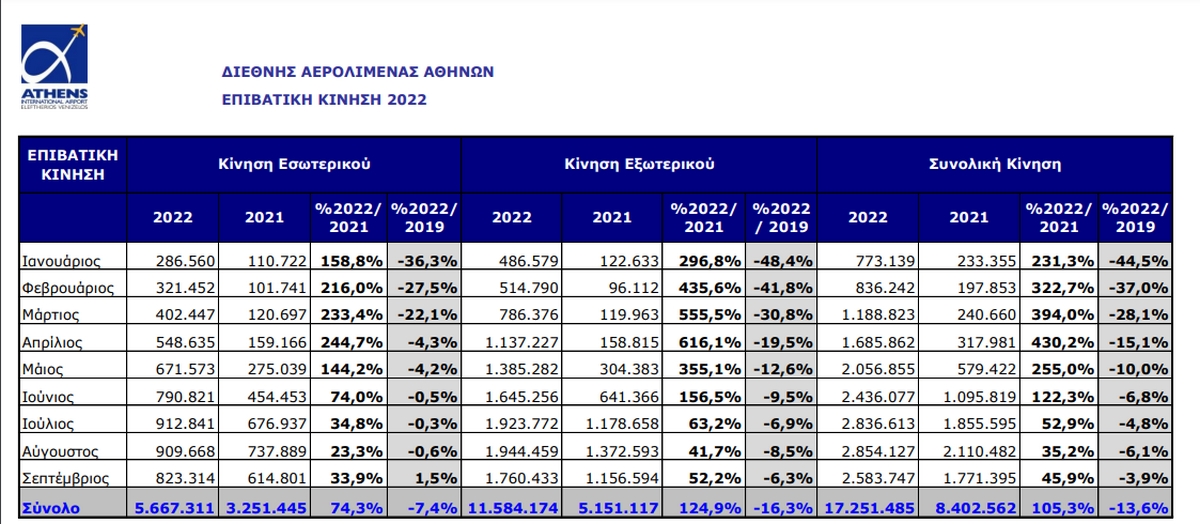 Ως ο καλύτερος μήνας του έτους μέχρι αυτή τη στιγμή αναδεικνύεται ο Σεπτέμβριος για το αεροδρόμιο της Αθήνας, αφού καταγράφηκε η μικρότερη μείωση της επιβατικής κίνησης, σε σχέση με το 2019.