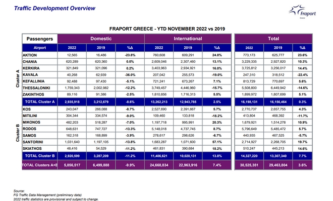 Η Fraport έδωσε στη δημοσιότητα τα στοιχεία του 11μηνου του 2022 από τα 14 αεροδρόμια που διαχειρίζεται και που δείχνουν άνοδο της συνολικής επιβατικής κίνησης, εσωτερικού και εξωτερικού, που ξεπέρασε τα 30 εκατομμύρια διερχόμενους επιβάτες και ποσοστό +3,6% σε σχέση με το ίδιο διάστημα του ’19. Τη μεγαλύτερη άνοδο από την αρχή του έτους κατέγραψε το αεροδρόμιο της Σαντορίνης, με τις διεθνή κίνηση να κάνει άλμα κατά 57,1% και 1,68 εκατομμύρια επιβάτες. Ακολούθησε η Μύκονος με αύξηση 20,3% επίσης στη διεθνή κίνηση, ενώ σημαντικά ήταν τα ποσοστά ανόδου και για Ρόδο και Κω με 8,7% και 5,7% αντίστοιχα και πάντα σε σχέση με το ενδεκάμηνο του 2019.