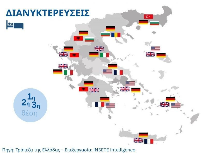 Οι διανυκτερεύσεις διαμορφώθηκαν στις 231 εκατ., παρουσιάζοντας αύξηση +1,4% σε σχέση με το 2023. Η Περιφέρεια Βορείου Αιγαίου σημείωσε εντυπωσιακή άνοδο +50,8%, εδραιώνοντας την τάση της ως αναδυόμενος προορισμός με μεγαλύτερη διάρκεια παραμονής.