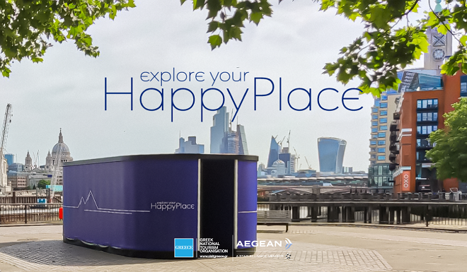 Η καμπάνια «Explore Your Happy Place» ξεκίνησε πριν μερικές εβδομάδες με ένα υπαίθριο activation στο Λονδίνο. Ένα εντυπωσιακό «Happy Place Booth», το οποίο κατασκευάστηκε εξαρχής από τον ΕΟΤ και την AEGEAN, τοποθετήθηκε στην περιοχή Southbank για 2 ημέρες και καλούσε τους περαστικούς να περάσουν μέσα για να ζήσουν μια διαδραστική ταξιδιωτική εμπειρία: με την καθοδήγηση ενός κρυμμένου αφηγητή, κάθε παίκτης απαντούσε σε μερικές ερωτήσεις προκειμένου να βρει το δικό του «Happy Place».