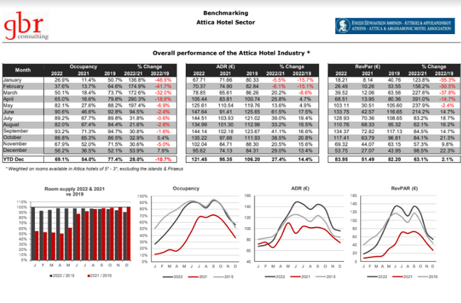 Σύμφωνα με τα στοιχεία της Ένωσης Ξενοδόχων Αθηνών – Αττικής, η μέση πληρότητα του έτους ανήλθε σε 69,1% και υπολείπεται αρκετά από την αντίστοιχη του 2019 (77.4%), ως συνέπεια των πρώτων μηνών του 2022 που οι πληρότητες ήταν πολύ χαμηλές και έφτασαν και στο -50% σε σχέση με το 2019.