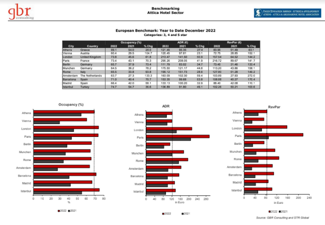 Οι ανταγωνιστές πόλεις της Αθήνας σε επίπεδο έτους κινήθηκαν οι περισσότερες με χαμηλότερη μέση πληρότητα, πούλησαν όμως τα δωμάτια τους σε υψηλότερες τιμές και είχαν περισσότερο έσοδο ανά διαθέσιμο δωμάτιο. Το Παρίσι είναι η πόλη που έχει μακράν τις καλύτερες επιδόσεις στα ξενοδοχεία της, με μέση πληρότητα το 2022 στο 73,4%, μέση τιμή δωματίου στα 295,26 ευρώ και έσοδο ανά δωμάτιο στα 216,72 ευρώ. Τα ξενοδοχεία της Κωνσταντινούπολης είναι αυτά με τη μεγαλύτερη μέση πληρότητα το 2022, στο 74,7% και μέση τιμή δωματίου 136,89 ευρώ.