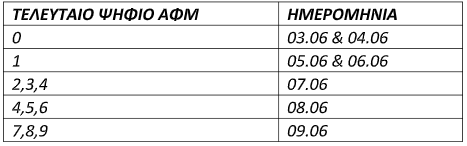 Η πλατφόρμα θα ανοίγει σταδιακά ανάλογα με το τελευταίο ψηφίο του ΑΦΜ των ενδιαφερόμενων δικαιούχων έως τις 9.6.2024 και ώρα 23:59, ως εξής: