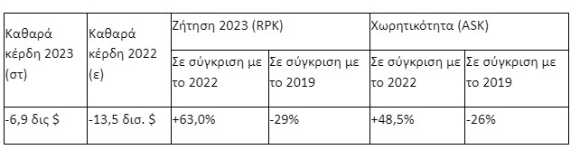 Σύμφωνα με ανακοίνωση της Διεθνούς Ένωσης Αερομεταφορών (IATA), τα καθαρά κέρδη της αεροπορικής βιομηχανίας αναμένεται να φτάσουν τα 9,8 δισ. δολάρια το 2023 (1,2% καθαρό περιθώριο κέρδους) που είναι υπερδιπλάσιο από την προηγούμενη πρόβλεψη των 4,7 δισ. δολαρίων, που είχε εκτιμηθεί τον Δεκέμβριο του 2022. Τα λειτουργικά κέρδη της βιομηχανίας αναμένεται να φτάσουν τα 22,4 δισ. δολάρια το 2023, πολύ βελτιωμένα σε σχέση με την πρόβλεψη του Δεκεμβρίου για λειτουργικά κέρδη 3,2 δισ. δολαρίων. Είναι επίσης υπερδιπλάσιο από τα λειτουργικά κέρδη 10,1 δισ. δολαρίων που εκτιμάται για το 2022.