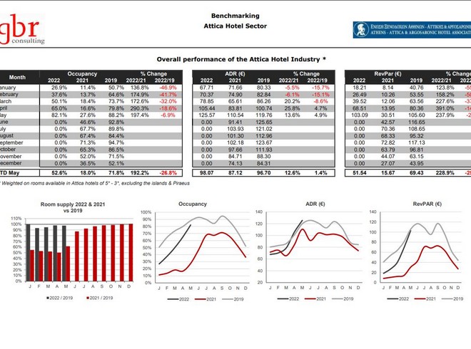 Σύμφωνα με τα στοιχεία της Ένωσης Ξενοδόχων Αθηνών Αττικής και Αργοσαρωνικού, παρά τις αισιόδοξες προβλέψεις και εκτιμήσεις και την ορατή σε όλους αύξηση της ροής ξένων επισκεπτών προς την Αθήνα, το Α’ 5μηνο του 2022 ολοκληρώθηκε για τα ξενοδοχεία με πτώση της τάξης του -26.8% στην πληρότητα, πτώση κατά 25.8% στο Έσοδο ανά Διαθέσιμο Δωμάτιο (RevPar) και μόνο η Μέση Τιμή Δωματίου παρουσίασε μικρή θετική μεταβολή (κατά 1.4%) έναντι του αντίστοιχου πενταμήνου του 2019.