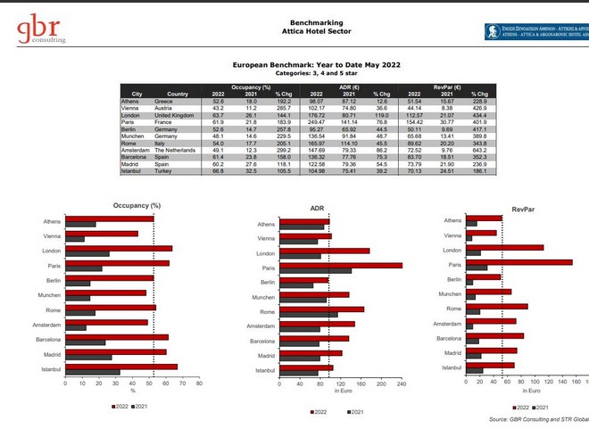 Προβληματισμός επικρατεί στα ξενοδοχεία της Αθήνας, αφού όπως δείχνουν τα στοιχεία των πόλεων ανταγωνιστών της, σε επίπεδο 5μήνου προκύπτει πως την ίδια περίοδο, Ιανουαρίου – Μαΐου 2022, πόλεις όπως η Βαρκελώνη, η Μαδρίτη, η Κωνσταντινούπολη, η Ρώμη, το Παρίσι, το Λονδίνο, η Βιέννη, το Μόναχο, κατέγραψαν σαφώς υψηλότερα επίπεδα πληρότητας και απέκτησαν παράλληλα μια εντυπωσιακή ώθηση στις τιμές τους. Το Παρίσι έφτασε πληρότητα 61.9% και μέση τιμή 249.47 ευρώ, η Ρώμη πέτυχε πληρότητα 54% και μέση τιμή 165,97 ευρώ, η Βαρκελώνη 61,4% και 136,32 ευρώ αντίστοιχα, η Μαδρίτη 60,2% και μέση τιμή 122,58 ευρώ και η Κωνσταντινούπολη πληρότητα 66,8% και μέση τιμή δωματίου 104,98 ευρώ, σε σύγκριση με την Αθήνα που είχε πληρότητα 52,6% και μέση τιμή δωματίου 98,07 ευρώ.