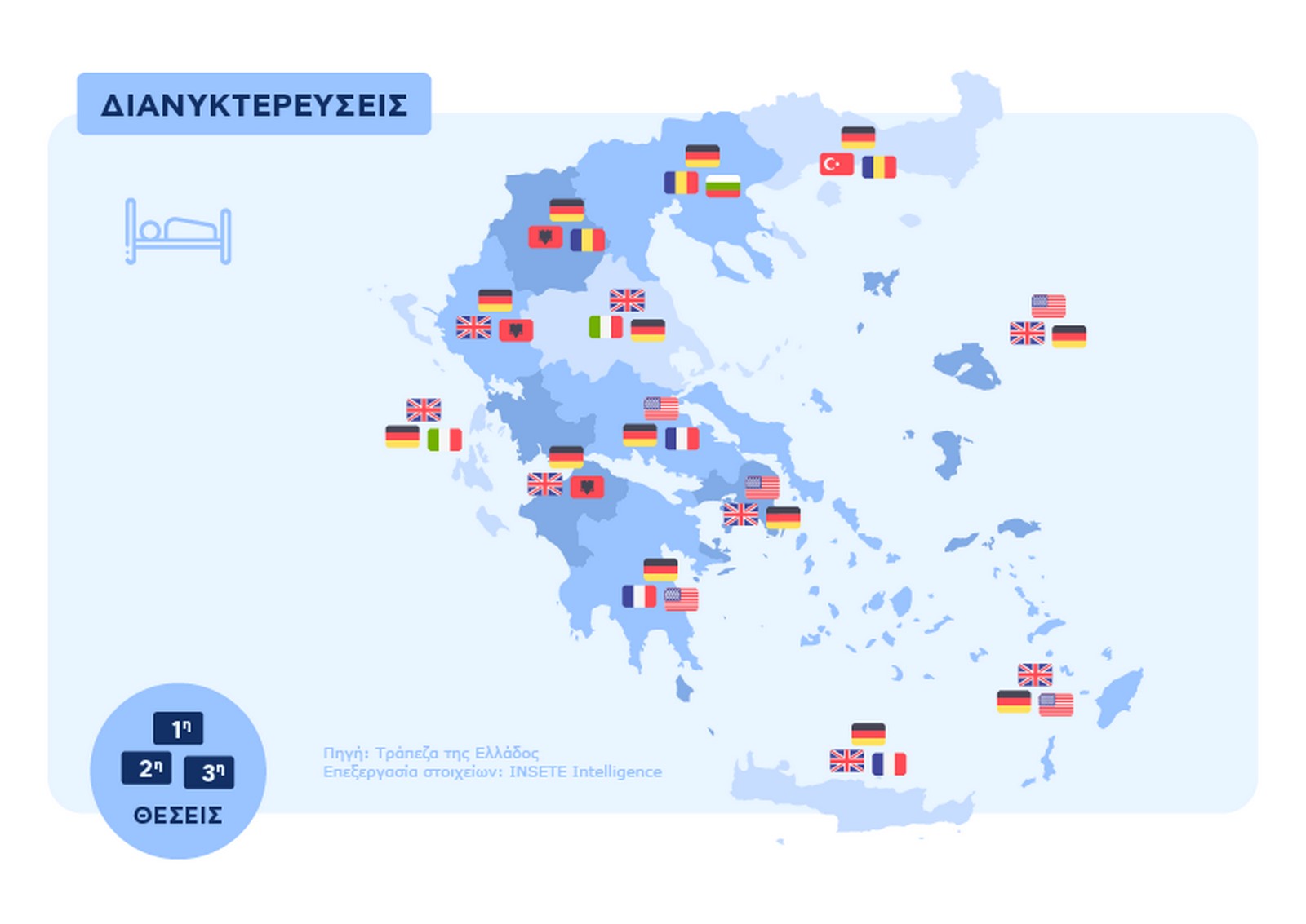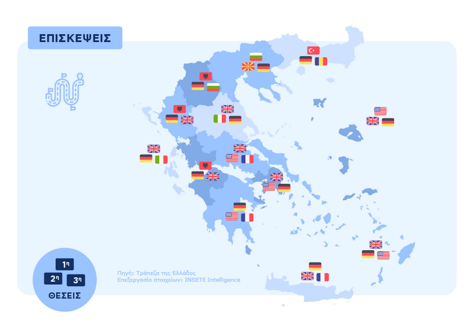 Σύμφωνα με την μελέτη του ΙΝΣΕΤΕ με τίτλο «Ποιος πάει πού; Πόσο μένει; Πόσα ξοδεύει;», οι κύριες αγορές εισερχόμενου τουρισμού με βάση τον αριθμό επισκέψεων ήταν η Γερμανία, το Ηνωμένο Βασίλειο και τρίτη η Βουλγαρία. Οι Τοp 3 περιφέρειες με βάση τη Δαπάνη ανά Επίσκεψη ήταν η Κρήτη, δεύτερη το Νότιο Αιγαίο και ακολούθησε το Βόρειο Αιγαίο.